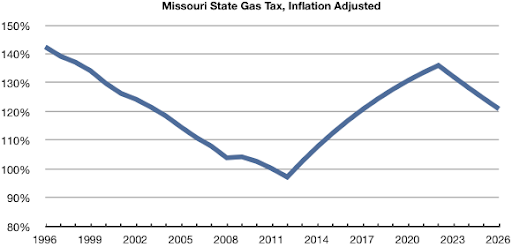 In 1996, the state gas tax was worth 40% more than what its worth today. And despite MoDOT’s proposal to nearly double the gas tax, the 10 year timeframe means that inflation will keep the gas tax from ever reaching the value it had in 1996.